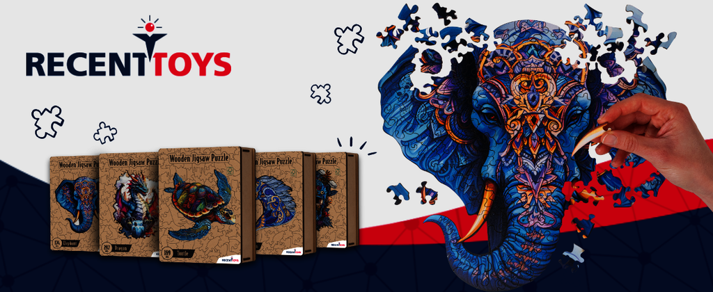 Originální dřevěné puzzle RECENTTOYS s motivem slona v modro-zlatém designu. Netradič...